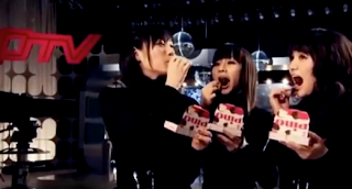 This video is really weird. It starts with the backstage of "PTV" (perfume television). Three white mannequins stand on the stage and then it turns out that the girls are the mannequins. They are lifeless until they are fed this Pino chocolate.